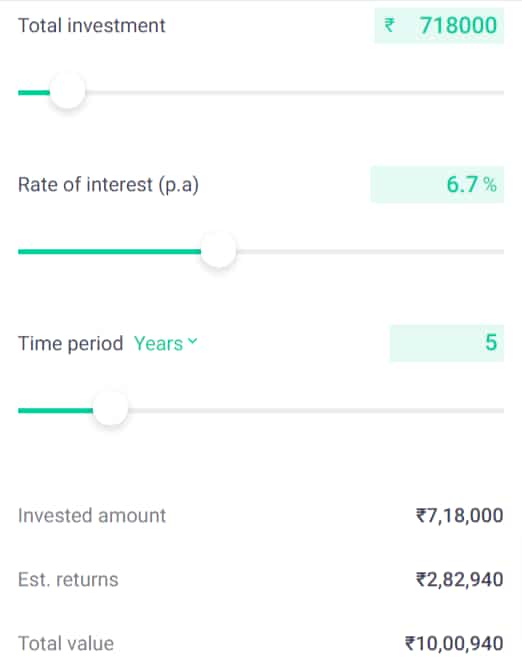 State Bank of India (SBI) introduced the UTSAV Deposit with advantages such as higher interest on the occasion of 75 years of independence. The period of this special scheme runs from 15.08.2022 to 28.10.2022 and the scheme comes with a tenure of 1000 Days or nearly 3 years approx. For domestic retail term deposits placed under the SBI UTSAV Deposit programme, non-senior citizens will earn an interest rate of 6.10%, and senior citizens would get an interest rate of 6.60%. So, taking into account the duration and interest rate of the UTSAV Deposit plan, an investor would need to make a fixed deposit of Rs. 8.35 lakh for a duration of 3 years at an interest rate of Rs. 6.10% in order to get a maturity value of Rs. 10.01 lakh.