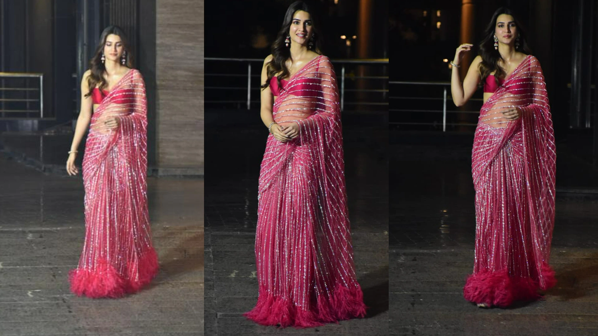 Kriti Sanon chose a red color saree for Sonam Kapoor’s Diwali party. Her sari was transparent and Kriti carried it with a red strappy blouse. Kriti looked stunning in this look.