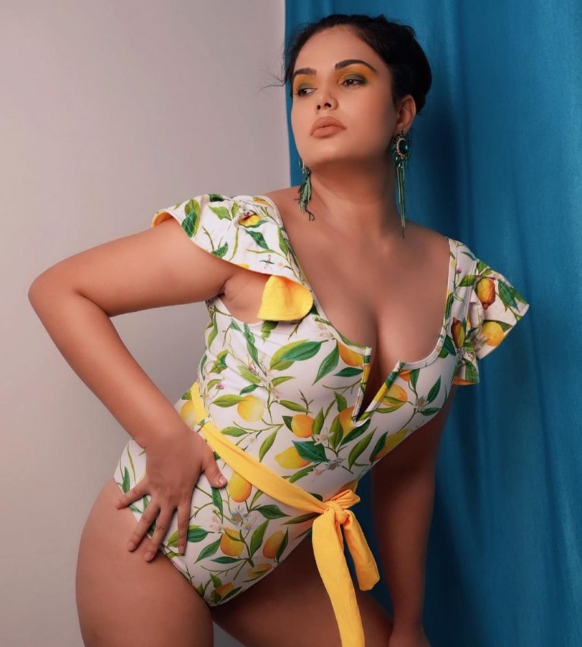 Anupama Agnihotri has flaunted her curvy figure by doing off shoulder in floral monokini.